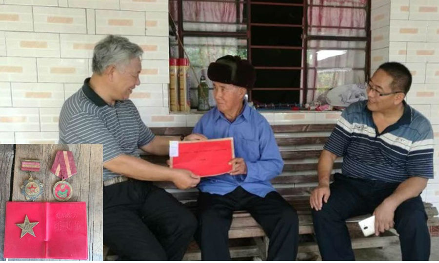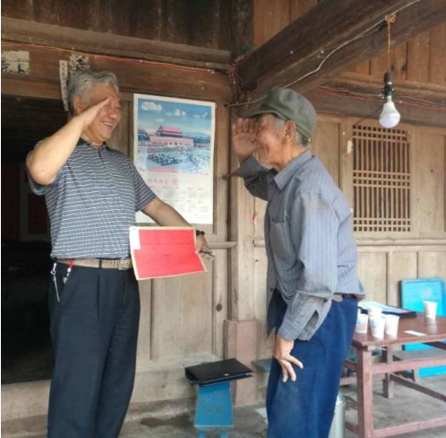 ▲慰問(wèn)寧洱縣同心鎮(zhèn)富強(qiáng)村拉格么組老兵楊發(fā)清。楊發(fā)清同志于1953年入伍,1954年入黨,當(dāng)過(guò)團(tuán)長(zhǎng)警衛(wèi)員,班長(zhǎng),為革命扛過(guò)槍,打過(guò)仗。