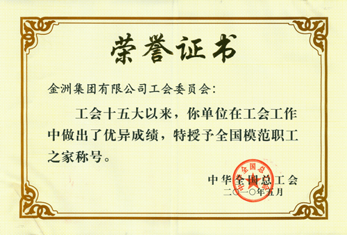 近日,金洲集團(tuán)工會委員會被中華全國總工會授予2010年“模范職工之家”榮譽稱號,這是中國工會系統(tǒng)的最高榮譽,也是繼2005年集團(tuán)工會被評為“浙江省模范職工之家”后獲得的又一殊榮。