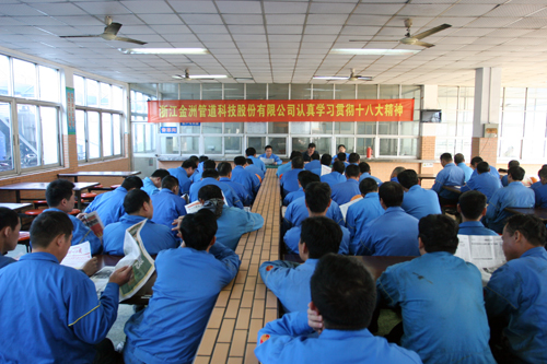 11月19日中午,管道工業(yè)黨支部召開黨員干部會(huì)議,黨支部書記鄭榮與公司黨員干部一起認(rèn)真研讀黨的十八大報(bào)告、黨章,對(duì)十八大報(bào)告中提出“五位一體”、“八個(gè)堅(jiān)持”、“兩個(gè)百年目標(biāo)”等亮點(diǎn)進(jìn)行了深入解讀和貫宣。鄭榮強(qiáng)調(diào)指出,學(xué)習(xí)十八大精神關(guān)鍵在于結(jié)合實(shí)際、狠抓落實(shí),要營(yíng)造學(xué)習(xí)宣傳貫徹十八大精神的濃厚氛圍,不斷激發(fā)廣大黨員干部和員工貫徹落實(shí)十八大精神的熱情,以更加求真務(wù)實(shí)的作風(fēng),有力地推動(dòng)企業(yè)健康穩(wěn)定發(fā)展。管道工業(yè)黨支部還發(fā)動(dòng)各車間、各部門開展學(xué)習(xí)活動(dòng),進(jìn)一步宣傳貫徹黨的十八大精神,將黨的十八大的理論與精髓帶到基層,傳達(dá)給每一位員工。