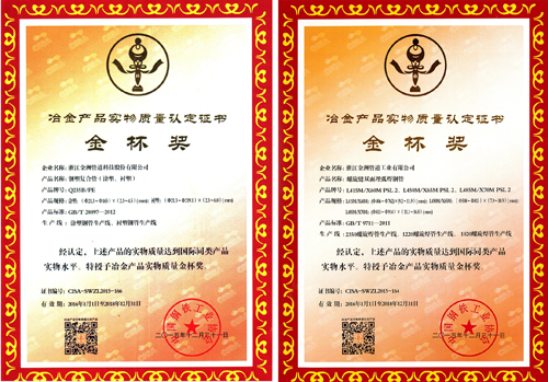 “金杯獎”,全稱:“冶金產(chǎn)品實物質(zhì)量金杯獎",是中國冶金行業(yè)授予冶金產(chǎn)品實物質(zhì)量的最高獎項。由中國鋼鐵工業(yè)協(xié)會,通過對照國內(nèi)外同類產(chǎn)品實物質(zhì)量,經(jīng)過專家客觀評價,對達(dá)到國際同類產(chǎn)品實物水平的產(chǎn)品給予“金杯獎”認(rèn)定,代表了國內(nèi)外先進(jìn)水平。金洲管道3項產(chǎn)品獲評,是中國鋼鐵工業(yè)協(xié)會和廣大客戶對金洲產(chǎn)品質(zhì)量高度認(rèn)可的結(jié)果,體現(xiàn)了金洲管道綜合競爭力和影響力的全面提升,堅定了公司進(jìn)一步加快轉(zhuǎn)型升級、加強自主創(chuàng)新、提高產(chǎn)品質(zhì)量、優(yōu)化產(chǎn)品服務(wù)的信念。