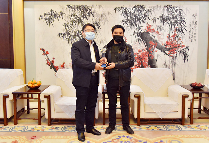 余勝奎書記向俞錦方董事長頒發(fā)“2019年度億千貿(mào)易獎”