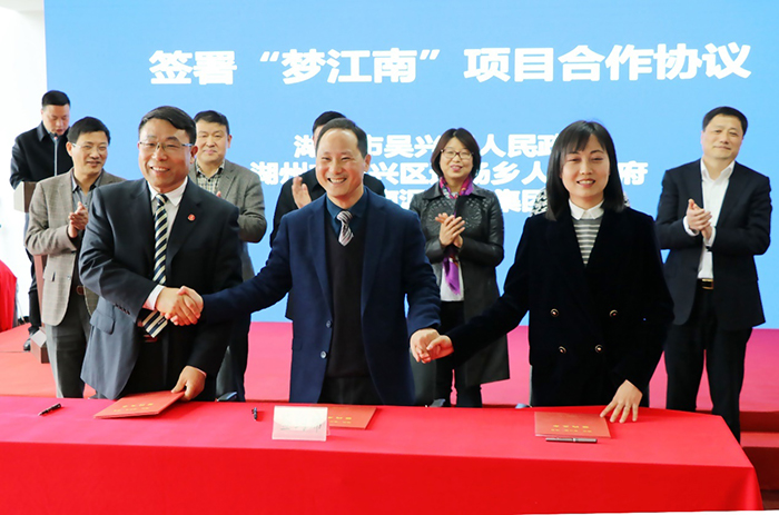 吳興區(qū)副區(qū)長(zhǎng)朱建忠,道場(chǎng)鄉(xiāng)黨委副書記、鄉(xiāng)長(zhǎng)王亞琪和金洲集團(tuán)、云南湄公河集團(tuán)董事長(zhǎng)俞錦方簽署“夢(mèng)江南”項(xiàng)目合作協(xié)議