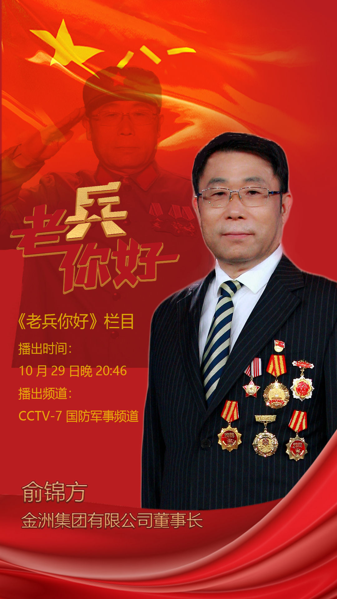 《老兵你好》二十大系列節(jié)目,將于10月29日晚20:46,在CCTV-7(國防軍事頻道)播出,為您深情講述全國最美退役軍人、金洲集團董事長、浙江老兵俞錦方的奮進故事,敬請收看!